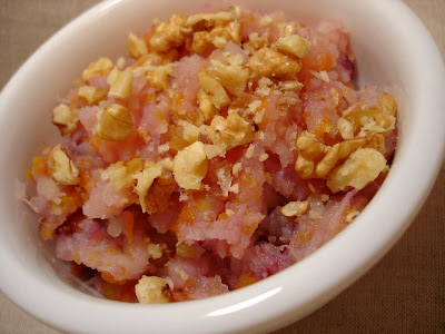 I jak wyzej : warzywa obrac, pokroic na kawalki i ugotowac na parze. Nastepnie przecisnac je przez praske (lub dobrze rozgniesc widelcem). Doprawic do smaku sola i przed podaniem polac olejem orzechowym oraz posypac zmielonymi orzechami.