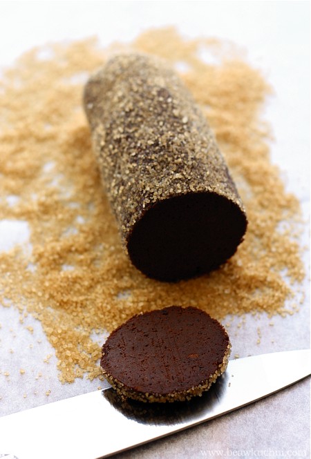 Ciasto wyciągnąć z lodówki, ściągnąć papier i pozostawić na blacie na ok. 5 minut (jeśli ciasto spędziło w lodówce całą noc i jest mocno twarde – kilka minut dłużej). Obtoczyć ciasto w cukrze i pokroić na plastry o grubości 5-6 mm. Ułożyć je na blasze wyłożonej papierem do pieczenia i piec ok. 9-10 minut (ciasteczka nadal mają być lekko miękkie gdy wyciągamy je z piekarnika). Wystudzić na kratce. Przechowywać w puszce.