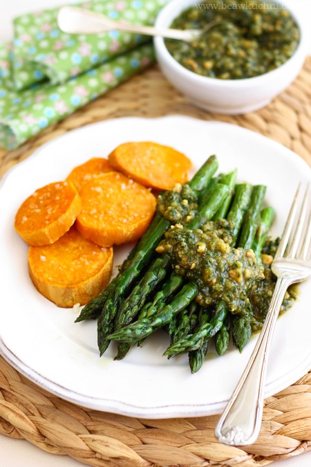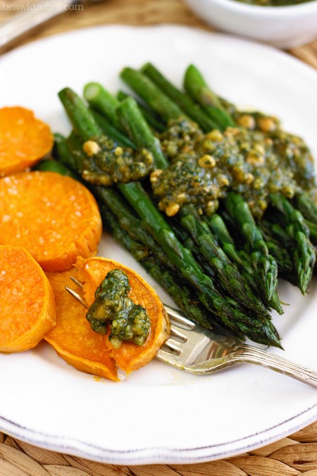 Szparagi (umyte, osuszone i pozbawione stwardniałych końcówek) przygotowałam w wersji stir fry z odrobiną sosu sojowego i podałam z pieczonymi batatami (połączenie to już w zeszłym roku wyjątkowo posmakowało mi w duecie ze szparagami – klik). Słodkie ziemniaki z dodatkiem tego aromatycznego pesto również smakują wyśmienicie! Będzie o nich jeszcze słów kilka w kolejnym wpisie.
