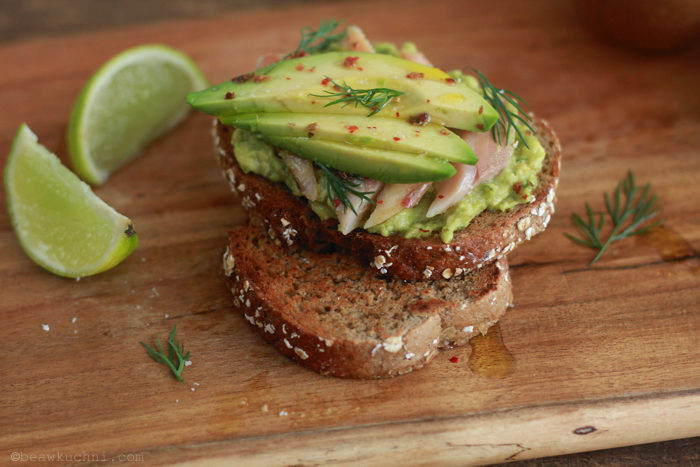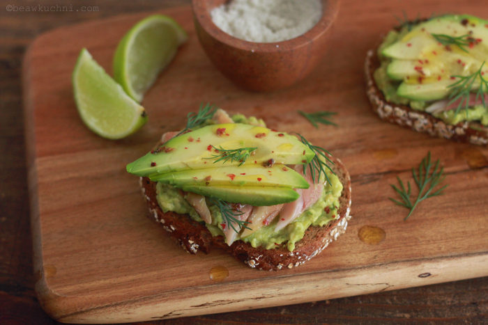 U mnie najczęściej pojawia się wersja ‘odwrotna’ – zmiast pasty rybnej na chlebie jest pasta z awokado, a na niej kawałki wędzonej ryby (podobnie jak w przypadku majowych grzanek ze szparagami – klik). Jeśli unikacie pieczywa, wystarczy zamiast niego użyć innego produktu (np. bezglutenowego czy o niskim ideksie glikemicznym) i zamiast kanapki przygotować np. sałatkę (quinoa czy większość kasz również dobrze tutaj pasuje).