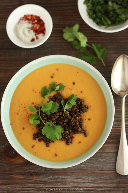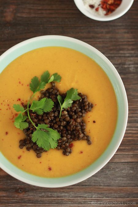 Podawać z ugotowaną soczewicą i świeżą kolendrą (ja posypuję zupę również odrobiną czerwonego pieprzu z młynka, ze względów czysto wizualnych).