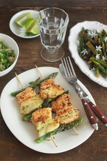 Cytrynowe szparagi były też wczoraj dodatkiem do rybnych szaszłyków, które serwowała moja niegotująca przyjaciółka. Niestety kupuje ona już gotowe, (surowe) szaszłyki, w których kawałki ryby oddzielone są plastrami papryki, którą my akurat nie najlepiej trawimy w takiej postaci (jedynie ta pieczona i obrana ze skórki nie powoduje żadnych ‘sensacji’…). Postanowiłam zatem pozbyć się kawałków papryki i przygotowałam nową wersję szaszłyków nabijając na patyki rybę rozdzielaną główkami szparagów (a odcięte ich części trafiły do zupy).
