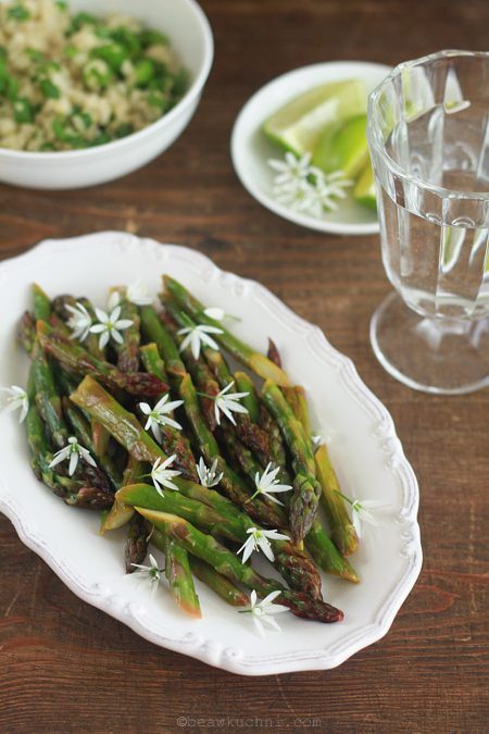 Tradycyjnie już jako pierwsze pojawiły się na stole szparagi w wersji cytrynowej – klik, choć tym razem przygotowane na patelni (piekarnik zajęty był bowiem przez rabarbarowe bułeczki, ale o nich będzie słow kilka następnym razem :)). Posypane zostały kwiatami kwitnącego właśnie czosnku niedźwiedziego, których subtelny, lekko czosnkowy i dosyć zaskakujący smak świetnie tutaj pasuje (a serwowane były z cytrynowo-‘szyczypiorową’ komosą).