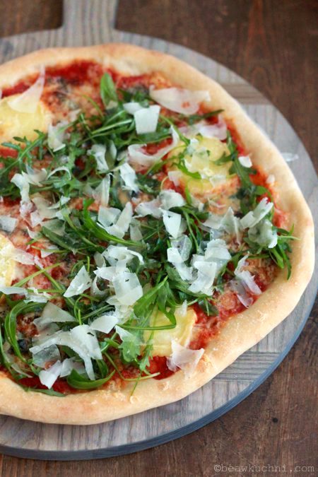 Na przełomie lata i jesieni naszą ulubioną wersją jest pizza z cukinią i serem roquefort (dawniej bywała z gorgonzolą) z dodatkiem orzeszków piniowych, a jesienią również ta z dodatkiem plastrów pieczonej dyni (i dla mnie z szynką parmeńską). Najważniejszym jednak składnikiem naszej pizzy pozostaje dobry ser, a najchętniej kilka jego gatunków (na szczęście udało mi się znaleść tutaj pewien owczy ser, który świetnie się topi, używam go więc od czasów alergii jako zamiennika np. mozzarelli na pizzy; smak oczywiście zupełnie inny, ale jak się nie ma co się lubi… ;), poza tym i tak cieszę się, że uczulona jestem ‘tylko’ na produkty wytwarzane z mleka krowiego i że mogę bez problemu konsumować te owcze i kozie, które uwielbiam :)).
