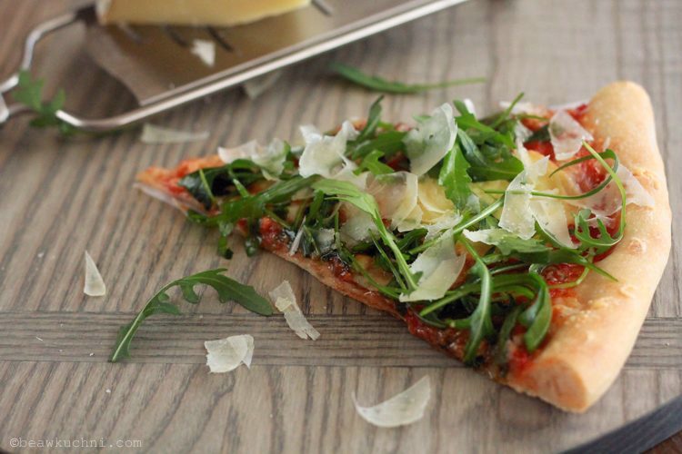 Jako sosu pomidorowego używam pomidorowej passaty (bio, z butelki), którą wcześniej odsączam na sicie, by pozostała tylko ta dosyć gęsta pulpa (odsączony płyn wraca do butelki i następnego dnia najczęściej trafia do warzywnej lub soczewicowej zupy). Do pulpy często dodaję niepełną łyżkę oliwy, trochę octu balsamicznego i do tego zioła – bazylia, oregano lub tymianek, czasami trochę rozmarynu (latem używam świeżych ziół, poza sezonem – suszonych). Do tego oczywiście sól i pieprz, a dla rozgrzewki – spora szczypta płatków chilli (latem pomijam, czasami dodaję 1-2 ząbki czosnku). A już po upieczeniu nakładam na pizzę rukolę wymieszaną uprzednio z odrobiną oliwy, octu balsamicznego i szczyptą soli – uwielbiam jej wyrazisty, lekko pieprzny smak (zimą rzadko kupuję rukolę, czekam zawsze na tę sezonową z ‘naszej’ farmie). I na koniec jeszcze kilka ‚wiórków’ mojego ukochanego pecorino :)
