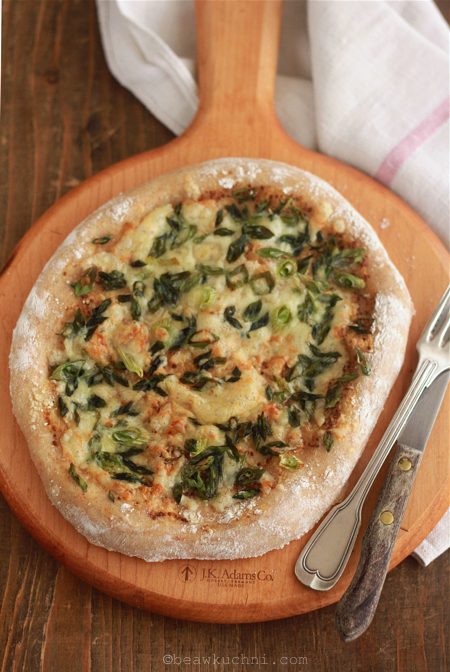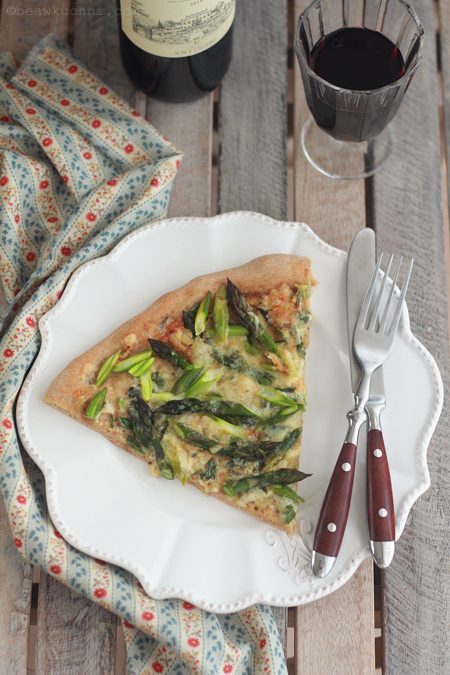 Z ‘nowości’ zaś powstała w tym roku pizza ze szparagami, na bazie opublikowanego niedawno ciasta na piwie – klik. Tak jak w oryginale – spód ciasta posmarowałam musztardą (na bazie białego wina i całych ziaren gorczycy), posypałam drobno posiekanym szczypiorem i dodałam pokrojone w ok. 3 cm kawałki szparagi (łodygi kroję na mniejsze kawałki, a główki – na dłuższe). Całość posypana została startym, owczym serem (wybierzmy dobrze topiący się ser, o dosyć wyrazistym smaku). Ewentualny dodatek np. szynki parmeńskiej również świetnie tutaj pasuje.