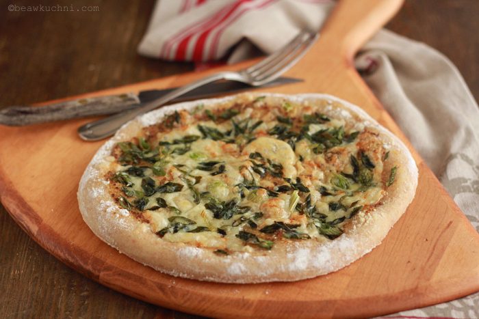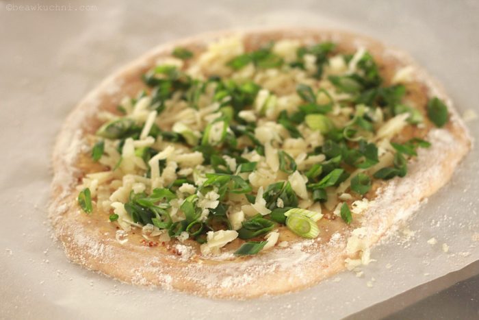Co w tej tarcie / pizzy jest tak szczególnego? Przede wszystkim samo ciasto, które przygotowuje się tutaj z użyciem piwa i to od niego właśnie zależeć będzie smak naszej tarty / pizzy; dobrze będzie użyć tutaj np. piwa ciemnego czy niefiltrowanego – kiedyś zutylizowałam piwo kasztanowe, które nadało wypiekowi wspaniałego, niepowtarzalnego smaku i charakteru. I do tego dodatki, które idealnie komponują się z tym piwnym ciastem : musztarda, cebula dymka i duuużo sera; w oryginale zaleca się użycie mieszanki do fondue moitié-moitié, czyli pół na pół ser Gruyère oraz Vacherin Fribourgeois, jednak każdy dobrze topiący się ‘charakterny’ ser będzie tutaj odpowiedni (jeśli dodamy go za mało, ciasto będzie po upieczeniu nieco ‘suche’).