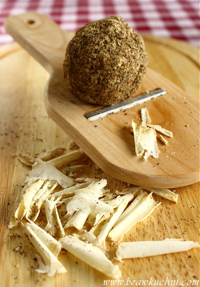 Jest to ser twardy, powstaje z mleka pasteryzowanego i dojrzewa przez minimum 9 tygodni. Po zakończeniu całego procesu dojrzewania, serowe kulki obtaczane są w mieszance czosnku, pieprzu i soli himalajskiej. Jak dla mnie, ten delikatny ser o lekko pikantnej otoczce jest naprawdę niezwykle oryginalnym ‘wynalazkiem’. I choć odkryłam go całkiem niedawno, to od tej pory regularnie gości on na naszym stole.