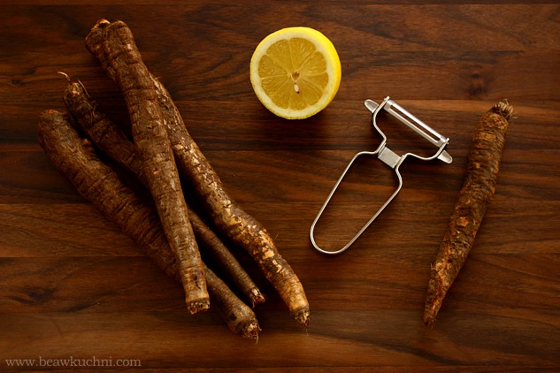 - skorzonera (czarna salsefia) to w Polsce chyba nadal dosyć rzadkie warzywo. Bogata przede wszystkim w witaminy z grupy B oraz w potas, wapń i magnez, w smaku przypomina nieco szparagi (często nazywana jest ‘zimowym szparagiem’). Obierając korzenie skorzonery umieszczajmy je od razu w naczyniu z wodą z dodatkiem soku cytrynowego, by warzywo nie sczerniało. Do obierania jej dobrze jest też zaopatrzyć się w gumowe rękawiczki, skorzonera bowiem wydziela mocno klejący się sok.