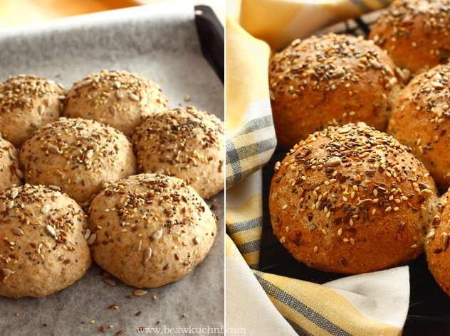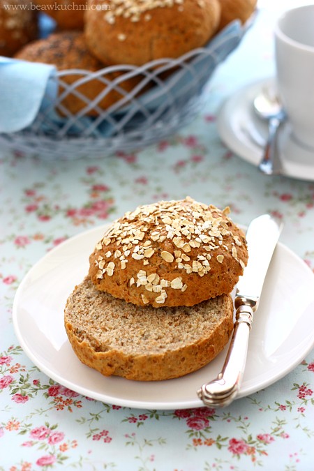 Ostatnio niestety częściej piekę na drożdżach niż na zakwasie (zasuszony cierpliwie czeka na użycie ;)) z powodów czysto ‘czasowych’, zakwasowe wypieki bowiem potrzebują jednak dłuższego czasu rośnięcia, na dodatek w kilku etapach. Dlatego gdy mam ochotę na coś ‘szybszego’ – piekę razowe bułki z dodatkiem drożdży. Z płatkami owsianymi, z mielonym siemieniem lnianym, czy najzwyklejsze – z dodatkiem mieszanki ulubionych ziaren.