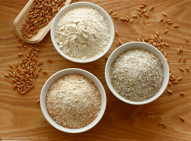 na dole – orkiszowa mąka razowa, po prawej – żytnia mąka razowa, u góry – tutejsza mąka typu 900 (Ruchmehl), z dodatkiem otrębów