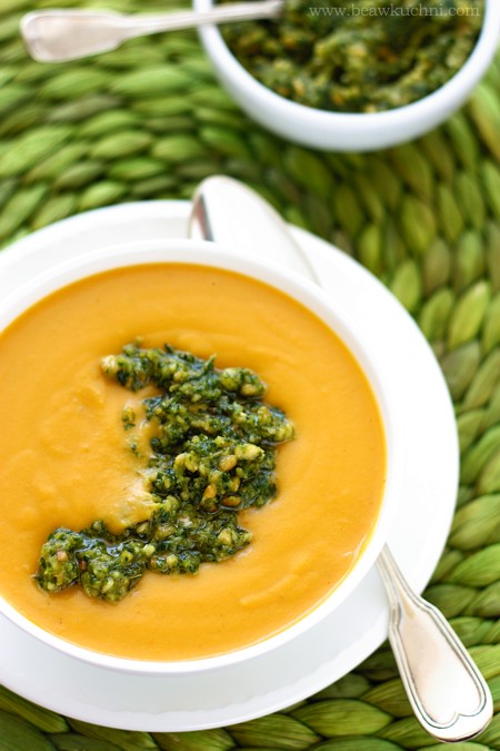 Bea, niesamowicie zainspirowalo mnie Twoje pesto! Brzmi naprawde wspaniale. Zupa rowniez wyglada przepysznie. Uwielbiam bataty. Przynajmniej raz w tygodniu pojawiaja sie one na naszym stole… Przewaznie pieke je w calosci w piekarniku. Moje malenstwo, ktore nie jest juz malenstwem, ale biegajacym po calym domu brzdacem, juz od 4-go miesiaca zycia zajada sie batami, kotre jak sama wiesz wprost pekaja od ilosci witamin i mineralow :) Przesylam Ci mnostwo slonca, ktorego u nas jest as za duzo tego lata (jest bezdeszczowo i niezmiernie goraco) :)