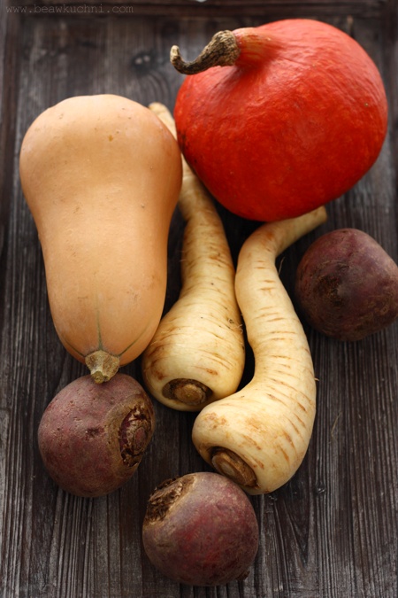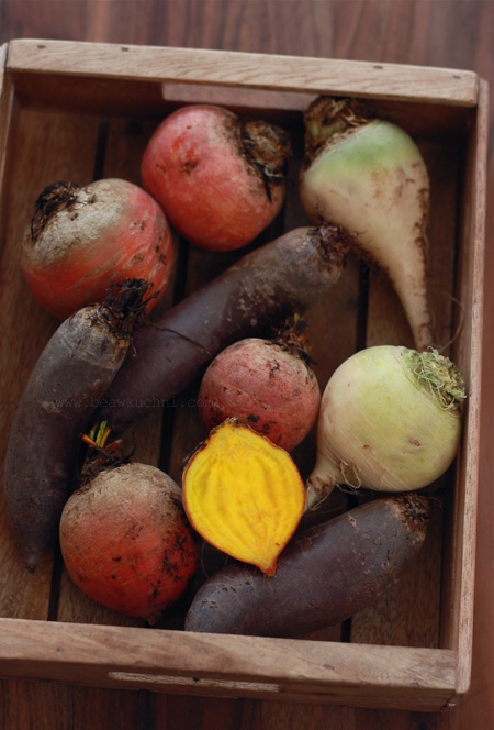 Warzywa, które mamy teraz do dyspozycji nie są może wizualnie tak atrakcyjne jak wiosenne nowalijki, potrzebują też zdecydowanie dłuższej ‘obróbki’, warto jednak pośwęcić im nieco naszego cennego czasu i włączyć je do jesienno-zimowego menu. A tym, którzy twierdzą, iż aktualne sezonowe warzywa są szare i nudne, polecam mariaż żółtych i ‘pasiastych’ buraków (odmiana ‘chioggia’) – czyż nie są urocze? :) W smaku są o wiele bardziej delikatne od poczciwego buraka ćwikłowego, sprawdzą się więc tam, gdzie nie chcemy ‚zagłuszać’ bardziej wyrazistych składników.