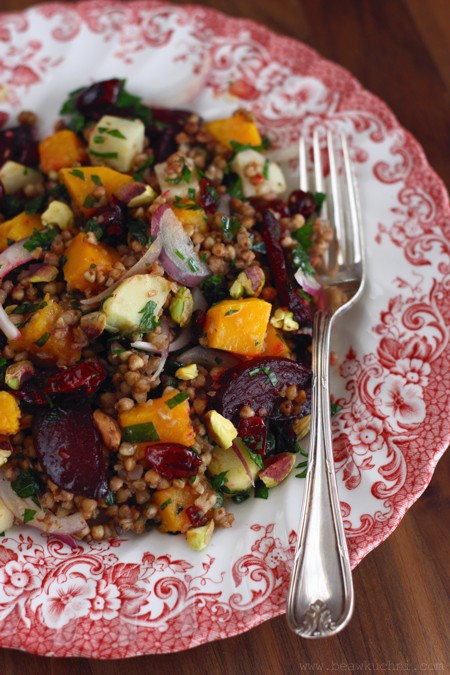 Do tego pieczona dynia, pasternak i korzeń pietruszki (warzywa piekłam w 200°, do miękkości, lekko posolone i skropione oliwą, przez ok. 30 minut – buraki nieco dłużej), prażona kasza gryczana oraz pomarańczowy vinaigrette : ok. 3 łyżki oliwy + 3 łyżki wyciśniętego soku z pomarańczy + niecała łyżka redukcji octu balsamicznego / ‘kremu’ (lub ok. 1 łyżka octu balsamicznego + odrobina miodu lub syropu z agawy); sos mieszamy z połową czerwonej cebuli (kroimy ją w cienkie piórka) i dodajemy sporo posiekanej natki pietruszki; całość posypujemy lekko uprażonymi na suchej patelni orzechami lub pistacjami i suszoną żurawiną.