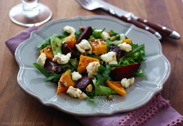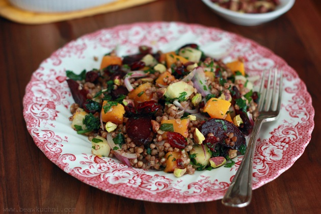 Mimo, iż ‘mięsożercom’ trudno w to uwierzyć ;) to sałatka ta jest naprawdę niezwykle sycąca; jeśli nie lubicie kaszy gryczanej, możecie użyć każdej innej lub też podać sałatkę np. z soczewicą czy komosą ryżową (quinoa). Wszelkie warianty są jak najbardziej dozwolone, choć mnie właśnie z kaszą gryczaną sałatka ta smakuje najbardziej :) A nadmiar pieczonej dyni i buraków podaję często w towarzystwie rukoli i koziego sera, idealnie bowiem do siebie pasują.