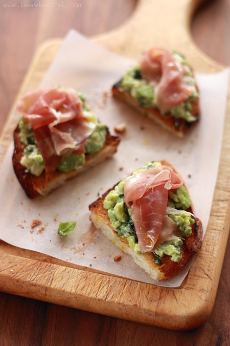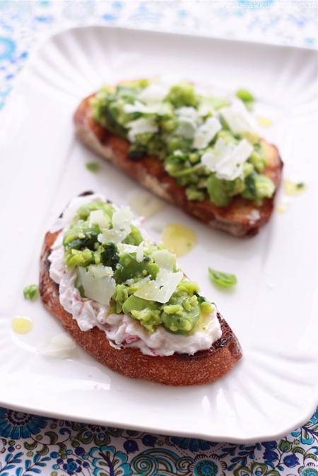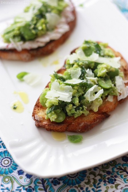Chleb zrumienić kilka minut na suchej, rozgrzanej patelni (lub w piekarniku, tosterze czy na patelni grillowej) i każdą kromkę skropić lekko oliwą (tradycyjnie tego typu grzanki naciera się również ząbkiem czosnku, tym razem jednak etap ten pomijam, jako iż czosnek jest już składnikiem pasty…). Posmarować chleb kremem rzodkiewkowym, a następnie nałożyć ok. 2 łyżki bobu. Przed podaniem posypać dodatkowo wiórkami sera.