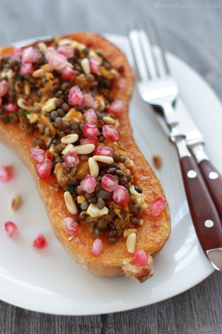 Doprawić do smaku i przełożyć farsz do połówek upieczonej dyni, ewentualnie ponownie zapiekając jeszcze przez 10-15 minut. Podawać z dodatkiem nasion granatu.