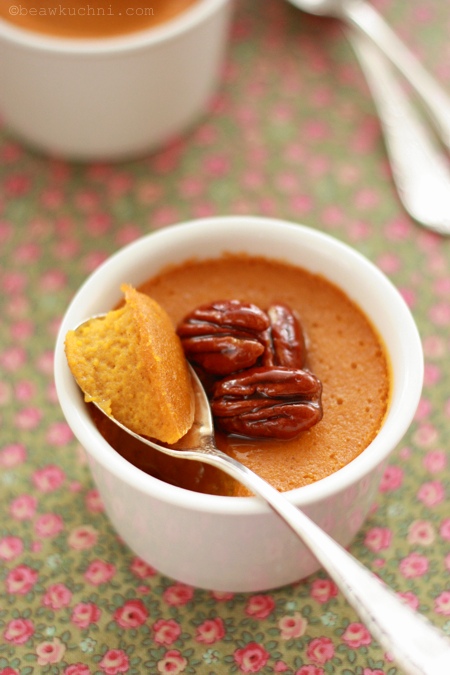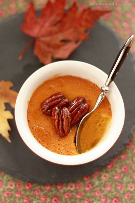 Kremy te są delikatne (pieczone w kąpieli wodnej), o korzenno-pomarańczowym aromacie, co wyjątkowo dobrze łączy się z dynią. Choć jeśli dyni nie lubicie, to deser ten będzie dla Was być może zbyt ‘dyniowy’ w smaku; dla mnie jednak jest idealny :)