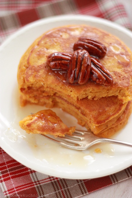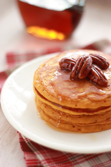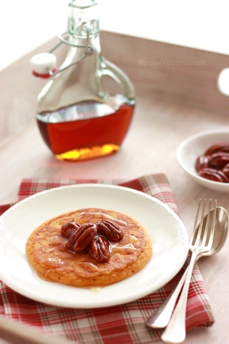 Kandyzowane pekany okazały się również świetnym dodatkiem do dyniowych ‘pankejków’, które moglibyśmy jeść praktycznie codziennie; przygotowuję je na bazie przepisu Marthy Stewart, dodaję jednak nieco więcej dyniowego puree i część mleka zastępuję jogurtem (owczym, ze względu na alergię…), co wg mnie bardzo dobrze wpływa na smak i konsystencję ‘pankejków’. I tutaj lubię dodatkową, lekko pomarańczową nutę, która świetnie komponuje się ze smakiem placuszków. Idealne na śniadanie czy na podwieczorek, szczególnie przy aktualnej, prawdziwie jesiennej aurze. Mam nadzieje, że i Wy sie skusicie? ;)