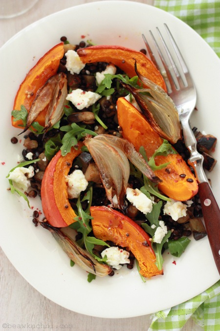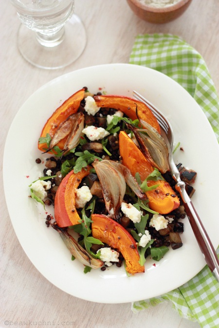 Tym razem wystarczy użyć Waszej ulubionej odmiany dyni, o dosyć suchym miąższu (np. Hokkaido, ale i Butternut się nada), którą pieczemy wraz z czerwoną cebulą, a później ‘dosmaczamy’ wszystko dressingiem i serwujemy z ugotowaną soczewicą, rukolą i pokruszoną fetą. Ja postanowiłam dodać tutaj również podsmażonego bakłażana, który wzbogacił smak sałatki, a do ‘resztek’ na lunch były też zrumienione orzechy włoskie, dzięki czemu danie jest naprawdę syte i bogate w dobre, zdrowe tłuszcze, których tak bardzo nam teraz jesienią i zimą potrzeba…
