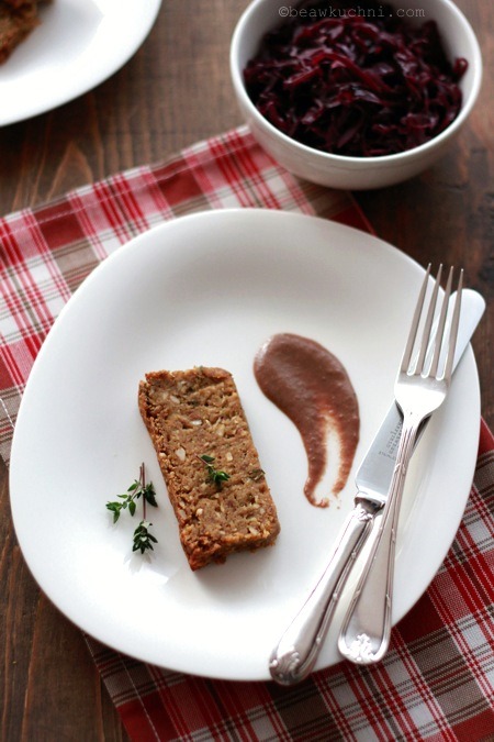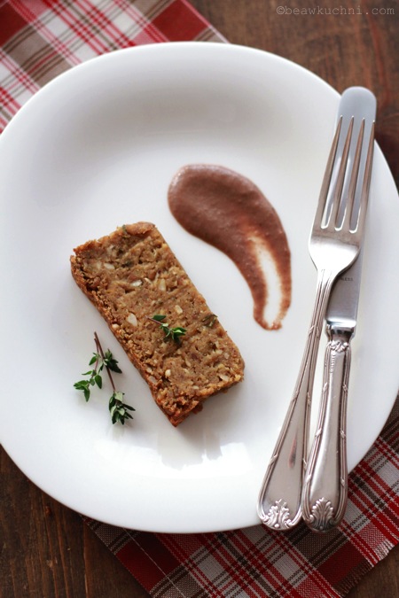Mój, poza tymi trzema składnikami, ma niewiele wspólnego z oryginałem, ale bardzo nam w tej wersji posmakował. Zamiast jajka dodałam ugotowaną czerwoną soczewicę, która pomaga zaspoić masę (a w drugiej wersji zamiast soczewicy był dodatek pasternaku i selera); nie dodałam bułki tartej, za to sporo orzechów i kasztanów i mimo, iż pasztet jest dosyć delikatny, to nie kruszy się, nie rozpada. Polecam upieczenie go w kąpieli wodnej, gdyż świetnie wpływa to na konsystencję pasztetu - jest dzięki temu kremowy i wilgotny.