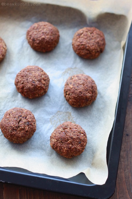 - możemy też upiec małe paszteciki formując z masy kulki (jak na zdjęciu obok), paszteciki mogą jednak wtedy być bardziej suche (pieczemy je przez ok. 30-35 minut w 200°); można też usmażyć je na patelni, formując spłaszczone kotleciki / coś à la orzechowe burgery – na drugi (i trzeci ;)) dzień smakują równie dobrze i świetnie sprawdzają się np. jako lunch do pracy, polecam!