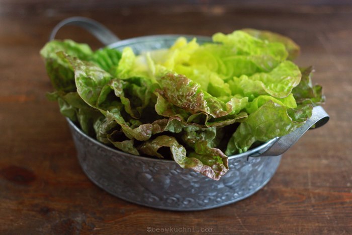 U mnie tym razem nieco więcej ziemniaków niż sałaty (jako iż zupa ta z założenia była ‘resztkowa’ ;)), w wersji mocno minimalistycznej (choć polecam też przygotowanie jej również w taki sposób, jak zupę z buraka liściowego – z dodatkiem białego wina). Używam tutaj sałaty rzymskiej, lecz w jednej z naszych lokalnych odmian (laitue de Morges, widoczna na pierwszym zdjęciu), której liście są nieco bardziej miękkie, o jaśniejszym zabarwieniu i lekko bordowych brzegach (wygląda trochę jak skrzyżowanie sałaty rzymskiej z dębową), a smak nieco delikatniejszy. Zaletą sałat rzymskich (zwarte główki o długich liściach) są właśnie ich chrupkie liście, dzięki czemu można z powodzeniem używać ich również do gotowania czy duszenia (np. zgrilowane serca takiej sałaty świetnie smakują z dodatkiem lekkiego dressingu; lekko podduszone też są świetnym, obiadowym dodatkiem).