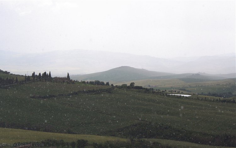 Niestety pogoda zaczyna dosyć szybko się zmieniać i pod koniec posiłku dociera do Monticchiello nie tyle burza, co oberwanie chmury w akompaniamencie olbrzymich kulek gradu.
