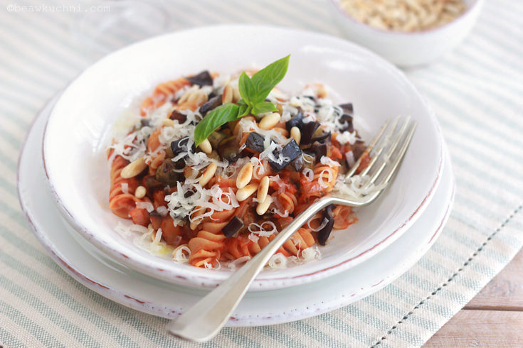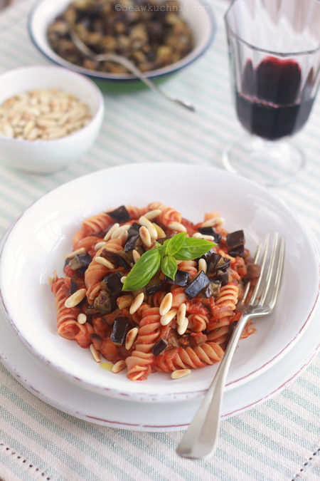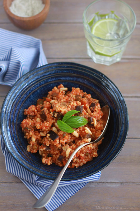 Podawać sos z makaronem lub z ulubioną kaszą – na zdjęciu poniżej z kaszą jaglaną (część bakłażana dodaję do sosu i mieszam bezpośrednio w garnku z ugotowanym al dente makaronem, a część pozostawiam jako dodatek do makaronu juz na talerzu); posypać startym parmezanem lub pecorino i zrumienionymi na suchej patelni orzeszkami piniowymi. Pałaszować natychmiast :)