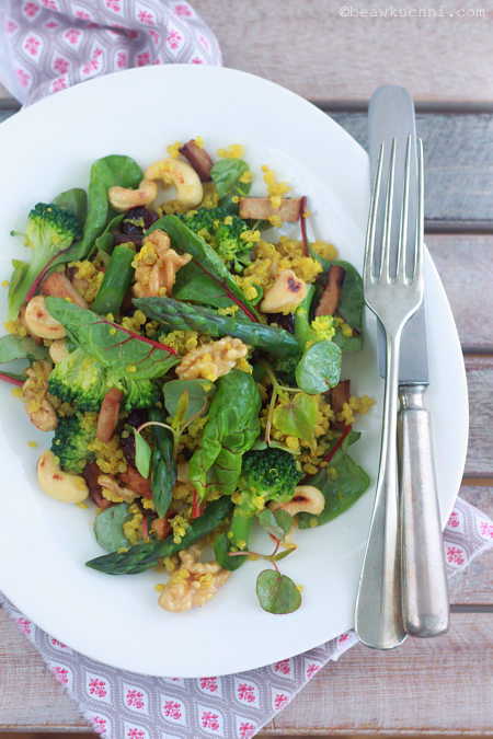 - komosa ryżowa / quinoa ugotowana z dodatkiem kurkumy (na 1 szklankę komosy dodaję 1 płaską łyżeczkę kurkumy oraz sporą szczyptę świeżo zmielonego pieprzu); przed gotowaniem płuczemy komosę w zimnej wodzie, aby pozbyć się odpowiedzialnych za gorzki posmak saponin (jeśli woda nie pieni się zbytnio – wystarczy jedno płukanie, jeśli jednak mocno się pieni i jest dosyć mętna – płuczemy ziarna 3 razy i odcedzamy na sicie), a następnie gotujemy ją dodając ok. 2 objętości wody (czyli na każdą szklankę nasion – ok. 2 szklanki wody) oraz ok. ½ łyżeczki soli (po ok. 12-15 minutach z ziaren wyłaniają się małe ‘sprężynki’, co oznacza, że komosa jest już ugotowana)