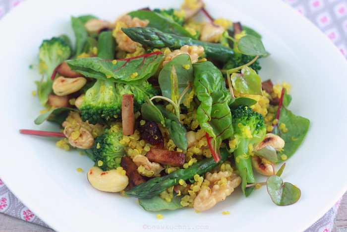 - ugotowane bardzo krótko na parze brokuły oraz szparagi, tak by wciąż pozostały lekko ‘al dente’ (pasują tu również te wcześniejsze szparagi w wersji sezamowej – klik)