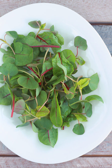 - młode listki gryki i buraka (na poniższym zdjęciu listki gryki to te mniejsze, lekko ‘sercowate’; bogate są np. w potrzebną organizmowi rutynę), choć możemy tutaj użyć również młodych listków szpinaku, którego zazwyczaj używam w tego typu sałatkach