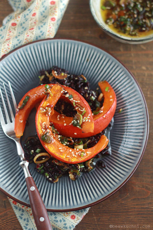 Ugotowany ryż wymieszać z kilkoma łyżkami dressingu i serwować z upieczoną dynią, skrapiając dodatkowo sosem tuż przed podaniem.