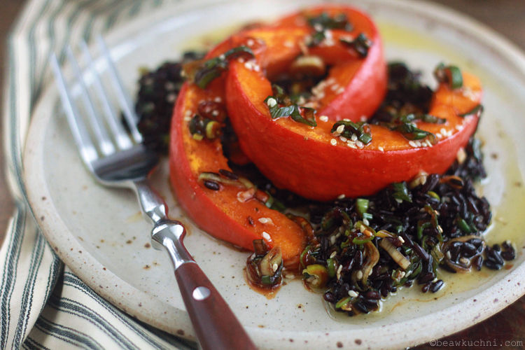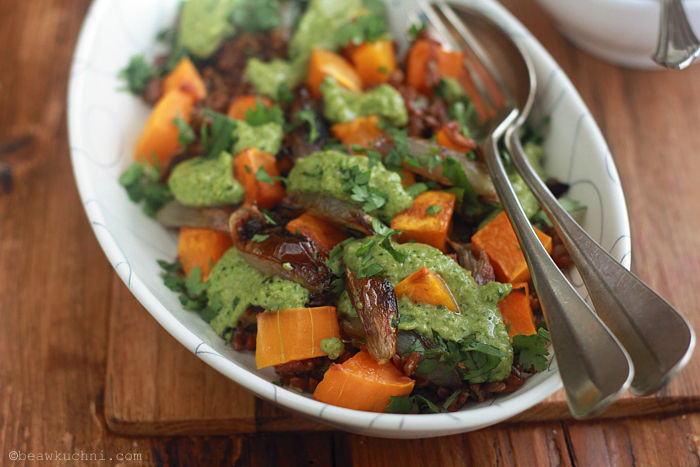 Druga propozycja pochodzi z blogu ‘101cookbooks’ i po raz pierwszy przygotowałam ją jakiś czas temu właściwie nie tyle z powodu dyni, co dla jej słonecznikowo-kolendrowego dressingu. Zamiast dzikiego ryżu często używam tutaj czerwonego ryżu z Camargue, ale tak naprawdę nawet kasze się tutaj nadadzą. Zmniejszyłam też ilość oliwy, miksując wszystko z większą ilością wody. A jeśli chcecie uzyskać dressing o bardziej wyrazistym smaku, można dodać tutaj również np. ząbek czosnku.