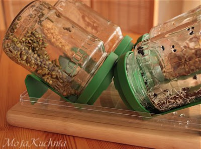 - a propos ‘odsączania’ nadmiaru wody po płukaniu kiełków : po wypłukaniu nasionek / kiełków nakładamy gazę + gumkę, odwracamy słoik i czekamy aż nadmiar wody wypłynie; następnie stawiamy słoik pod kątem, co umożliwi odpływ ostatnich kropli wody